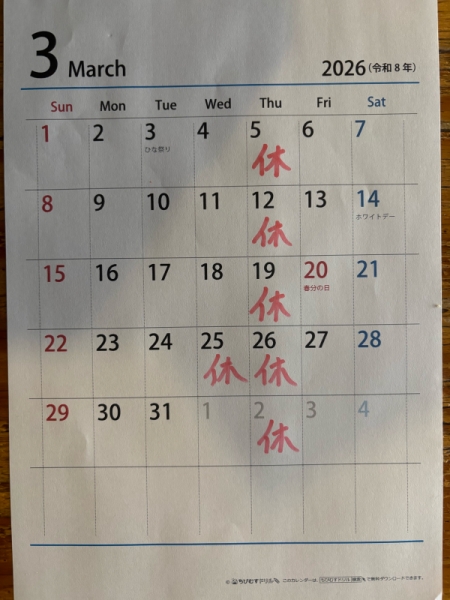 12月の店休日です。年内は29日までの営業で、年始は3日から営業します。よろしくお願いします。