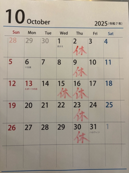 お世話になります。9月の店休日です。今月は木曜日の定休日と別に、27日〜29日の3日間お休みいたします...